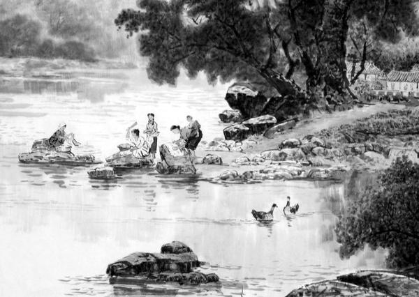 本来,洗衣裳是个苦活累活,而在河边洗衣裳却变成了观看风景、欣赏美景的轻快活。高天上,天蓝、云白、鸟飞;大河中,水流、草动、鱼游;长堤上,树摇、果肥、花红……尤其把双脚踏在水里,凉爽凉爽的,加之轻风吹拂,更使人感到周身舒适、满心舒畅。于是,姑娘媳妇们便放飞心灵,什么劳累、艰辛、烦恼、忧愁,都一股脑地烟消云散。