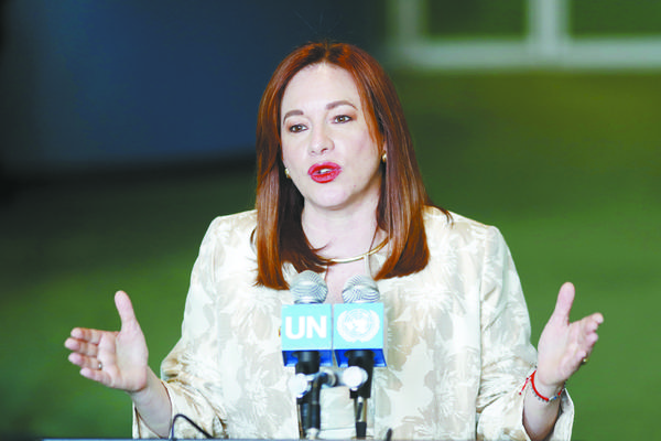 6月5日,在位于纽约的联合国总部,厄瓜多尔外长埃斯皮诺萨在当选第73届联合国大会主席后向记者发表讲话。第72届联合国大会5日选举厄瓜多尔外长埃斯皮诺萨为第73届联合国大会主席。埃斯皮诺萨将于今年9月新一届联大召开时接替现任联大主席莱恰克,她将是联合国历史上第4位女性联大主席。新华社发