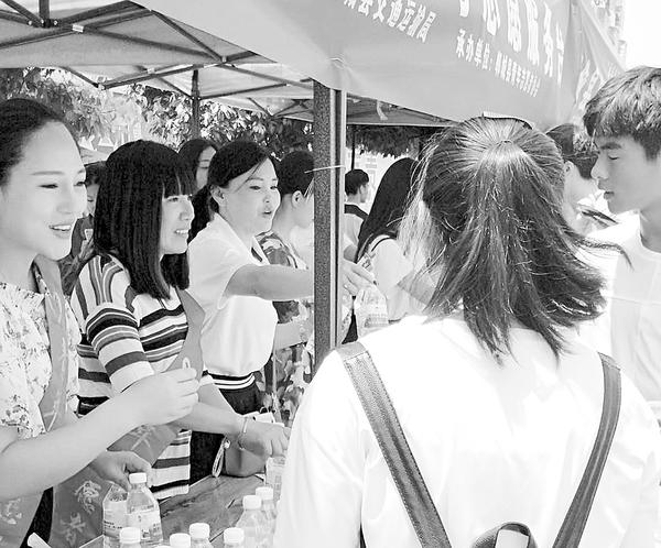 6月7日,高考第一天,郸城县部分政协委员和劳模组成志愿者服务队,走上街头,服务高考。图为志愿者为走出考场的考生免费发放纯净水。