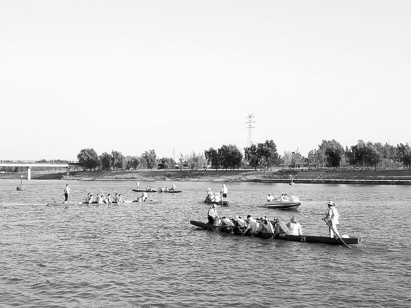 本报讯(记者 张志新 文/图) 6月12日,市区沙颍河周口大道桥附近水域,伴随着阵阵鼓声和铿锵有力的呐喊声,多条龙舟在水面上来回穿梭(如上图)。这是参加龙舟大赛的队伍训练时的场景。