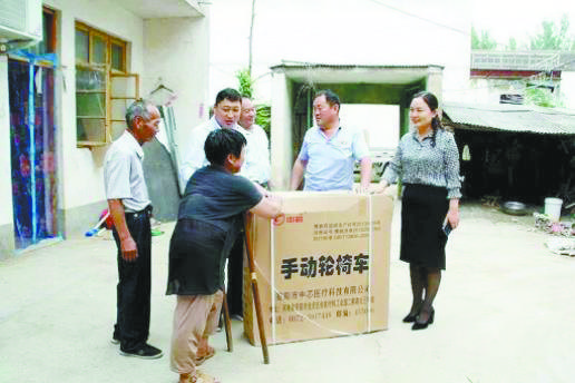 县残联工作人员为贫困残疾人赠送轮椅。
