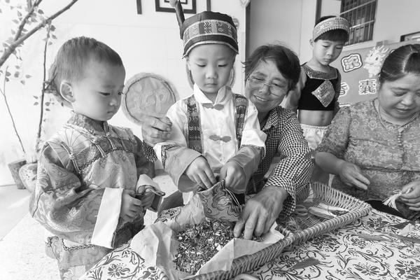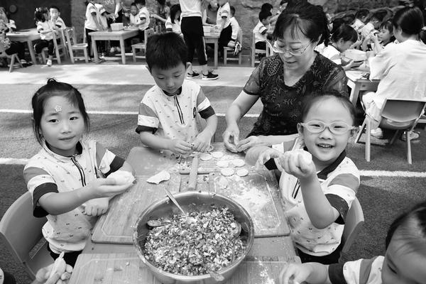 6月15日,在河南省郑州市二七区第一幼儿园,孩子们一起学习做菜角。