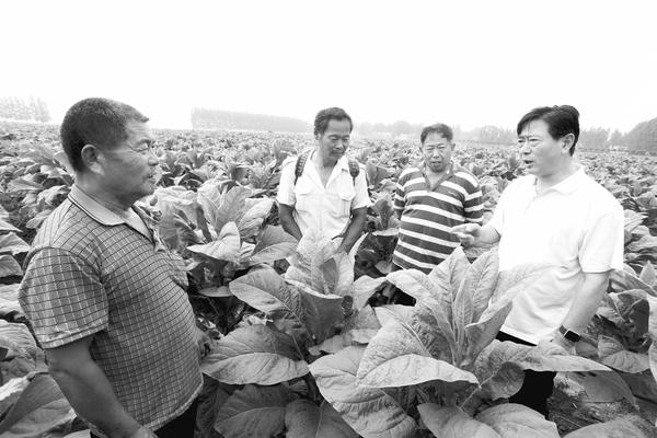 6月25日,商水县人大代表胡德华(右一)在袁老乡老虎庄村了解烟叶种植情况。近年来,该乡按照“一乡一业、一村一品”的发展思路,鼓励当地群众发展烟叶生产,从种植到收购,从技术指导到政策激励,多方引导烟农规模化、集约化种植,助力烟农增效增收。刘飞 魏红 摄