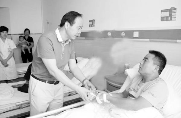 图为该医院的陈作恒院长把募集到的善款送到郁战胜的手中,勉励他增强信心,早日康复。记者 谢永静摄