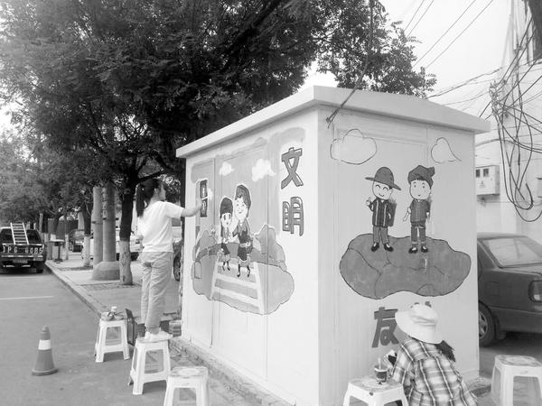 近日,走在中心城区大街小巷,细心的市民会发现,路边的变电箱纷纷穿上了“花衣裳”,原本单调的变电箱顿时生动起来,艺术范十足,成为繁华街区一道美丽的风景。据介绍,这些穿上“花衣裳”的变电箱主要集中在七一路、八一大道、交通大道、黄河路、中州大道、文昌大道、工农路等城市主次干道。这些以富强、民主、文明、和谐、诚信等为内容的彩绘宣传画在美化城市街景的同时,让创建文明城市的理念更加深入人心。图为彩绘师在变电箱上作画。