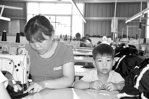 6月26日上午,商水县城关乡一名放假儿童陪着妈妈到村头的“巧媳妇”工程示范点工作。随着乡村振兴战略的实施,我市各乡镇在村头开办的渔网编织、玩具制造、服装加工等微型企业,吸引了大量妇女在家门口就业,让乡村儿童不再留守。 记者 付永奇 摄