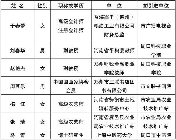 根据《周口市2016年度引进高层次紧缺人才(团队)优秀毕业生计划及实施方案》(周人才〔2016〕6号)和《河南省周口市中心城区事业单位2017年引进高层次紧缺人才公告》规定,经个人报名、资格审查、专家组评价、市委人才工作领导小组会议审议决定,拟认定7人为我市中心城区引进的高层次人才,现予以公示,以接受社会各界监督。若有异议,请在2018年7月5日前向市委人才办反映。