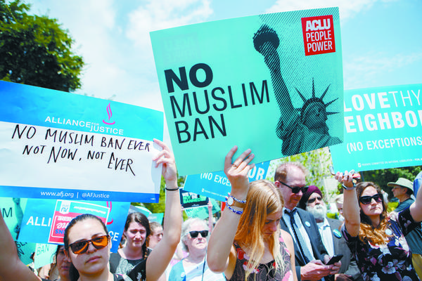 6月26日,在美国首都华盛顿,人们在联邦最高法院前抗议。美国联邦最高法院26日裁定,总统特朗普去年颁布的移民限制令“完全符合”总统职权范围。这是特朗普上台以来,联邦最高法院针对特朗普政府政策做出的第一个重要裁决。新华社发
