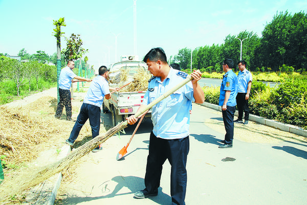今年“三夏”期间,周口港区严格按照“三不一无”工作要求,圆满完成了不着一把火、不冒一股烟、不黑一块地和主干道无一处打场晒粮现象的工作目标。图为周口港区城管队员及时清理堆积在路边的秸秆。记者 宋风 摄
