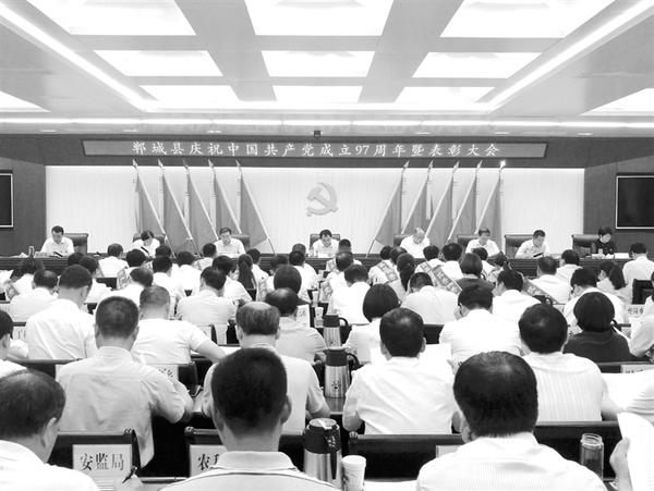 本报讯 (记者 徐松 通讯员 王璐 张杰 文/图) 6月27日上午,郸城县召开庆祝中国共产党成立97周年暨“七一”表彰大会(如图)。郸城县委副书记、县长李全林代表县委向先进集体和先进个人表示祝贺,并和与会县领导侯磊、吴青锋、王智华、吕振龙、马超、胡友涛、崔卫华一起,为先进集体和先进个人代表颁发奖牌和荣誉证书。