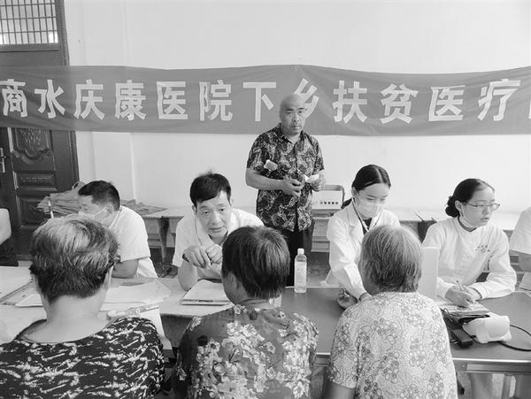 7月3日,商水县庆康医院扶贫医疗队医生正在邓城镇白帝村为村民义诊。该医院利用29天时间为邓城镇29个行政村群众开展义诊服务,除免费测血压、血糖,进行B超检查外,还对1200名贫困群众减免一半治疗费。