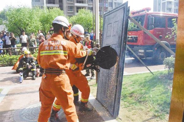 当天上午,东新区消防大队消防官兵们现场演示了如何正确使用灭火器进行楼层灭火、电动车灭火以及破拆防盗窗和防盗门等消防技能(如图)。随后,微型消防站队员们及现场居民拿起灭火器进行实际操作。