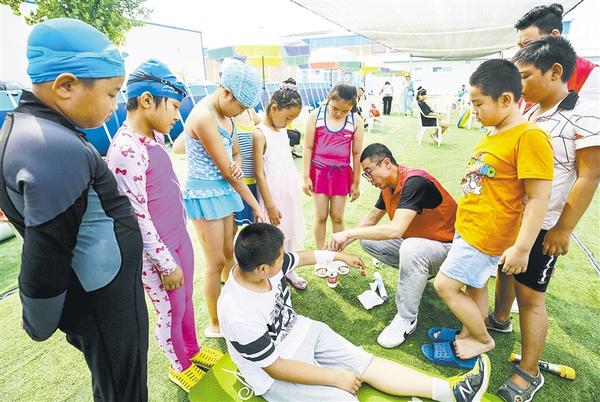 7月5日,志愿者为学生讲解外伤包扎知识。