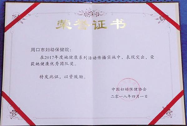 几分耕耘,几分收获。周口妇幼人凭借着自己的辛勤和努力,最终采得了一个又一个的硕果,先后获得“周口市创卫嘉奖单位”、“河南省十佳妇幼品牌医院”、“河南省十佳儿科品牌医院”、“省食品安全风险监测先进集体”、“省级卫生先进单位”、“省三八红旗集体”、“省巾帼建功先进集体”、“省卫计委妇幼健康服务技能竞赛团体三等奖”、“省卫计系统安全生产与消防工作先进单位”、“省健康促进示范医院”、“中国妇幼保健协会”、“她健康优秀团队奖”、“母婴友好医院”等荣誉和称号。