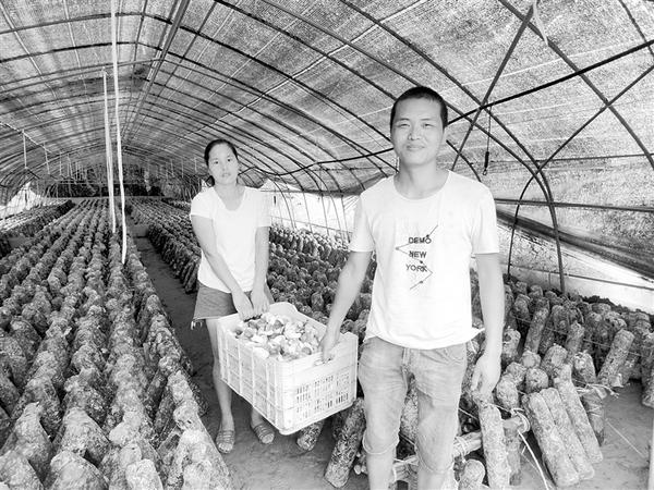 7月4日,商水县邓城镇江庄村江源种植农民合作社理事长江新峰和妻子李艳珂在采收香菇。2016年春季,在上海打工的江新峰、李艳珂决定返乡创业,他们在商水县发改委驻江庄村第一书记陈华鹏和邓城镇扶贫办的帮助下,投资60万元,修建30个大棚生产香菇,并以“合作社+农户+股份”形式带动和帮助贫困户脱贫致富。乔连军 摄