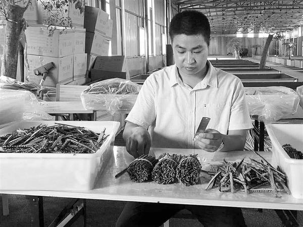 7月9日,沈丘县周营镇赵寨村青年农民赵振伟正在忙着包装蜈蚣干品。
