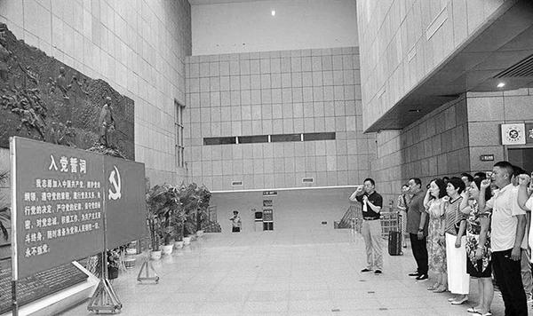 在纪念馆大厅,面对鲜红的党旗,大家举起右拳,以铿锵有力的声音,重温入党誓词,不忘初心,牢记使命,坚定信念和决心。