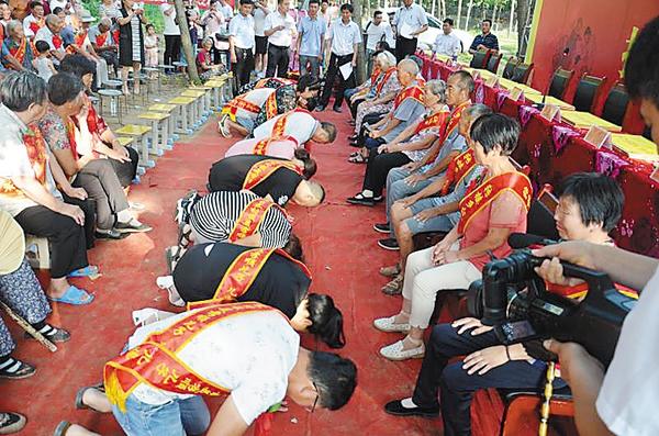 仪式上,转楼乡党委书记杨传俊宣布:“有请24位孝贤之家的孝顺儿子(儿媳)、孝顺侄子(侄媳)向父母(亲人)行孝贤叩拜之礼”。随之,排列整齐的孝贤儿女们一起鞠躬下跪,与会者受到感染也流下激动的泪水。孝顺儿子(儿媳)、孝顺侄子(侄媳)向父母(亲人)行孝贤叩拜之礼后,县领导向24个家庭颁发了“转楼乡孝贤之家”奖匾。会后,领导与24个孝贤之家合照了全家福。24位独居和特困老人披红戴花,在唢呐和礼炮声中,被自已子女、侄子(侄媳)接回家中一起居住生活,实现了合户合住合锅的“亲情赡养”目标。