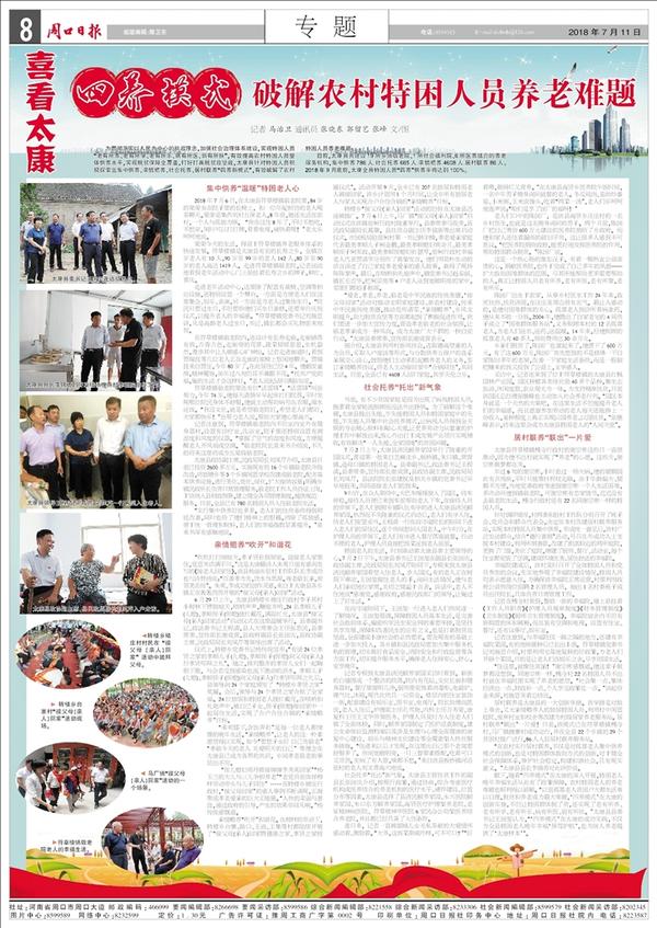 目前,太康县共建设19所乡镇敬老院、1所社会福利院、6所医养结合的养老服务机构,集中供养786人,社会托养665人,亲情赡养4608人,居村联养86人。2018年9月底前,太康全县特困人员“四养”供养率将达到100%。