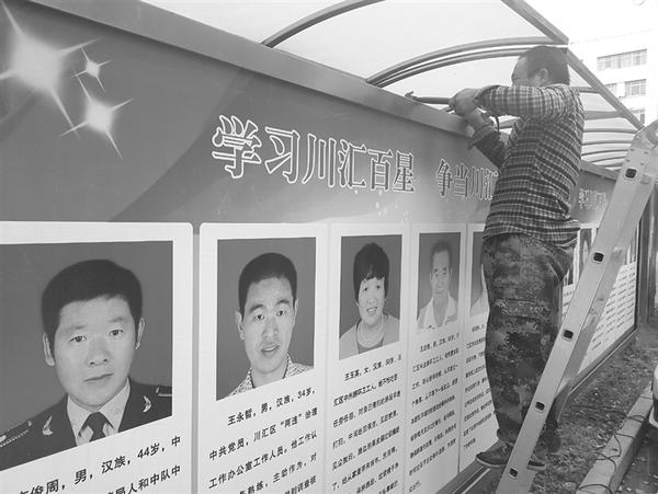 为表彰先进,弘扬正能量,川汇区将各行各业涌现出的、为全区经济社会发展和道德风尚建设作出突出贡献的“川汇百星”人物事迹制作成展板,在川汇区人民广场、道路两侧等公共区域进行展示,营造良好社会氛围。图为工人正在布置“川汇百星”展板。记者 刘俊涛 摄