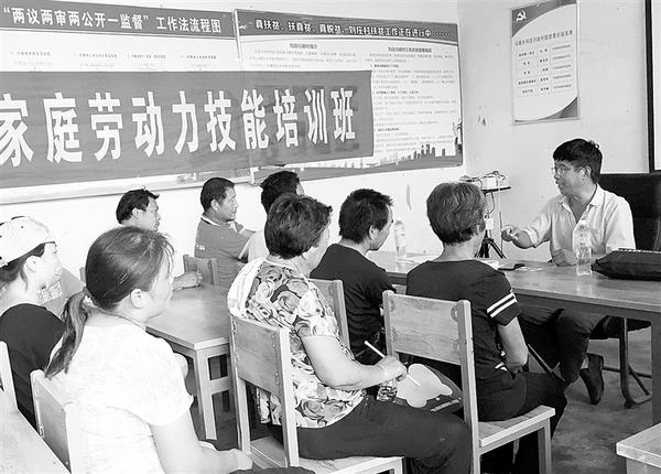 7月13日上午,农业专家在淮阳县冯塘乡刘庄行政村向贫困群众传授种植技术。周口报业传媒集团驻刘庄行政村工作队针对贫困家庭劳动力技能缺乏的突出问题,邀请淮阳县有关专家进村开展为期4天的技能培训,增强贫困家庭的“造血”功能。当天,30多名贫困群众参加了培训。