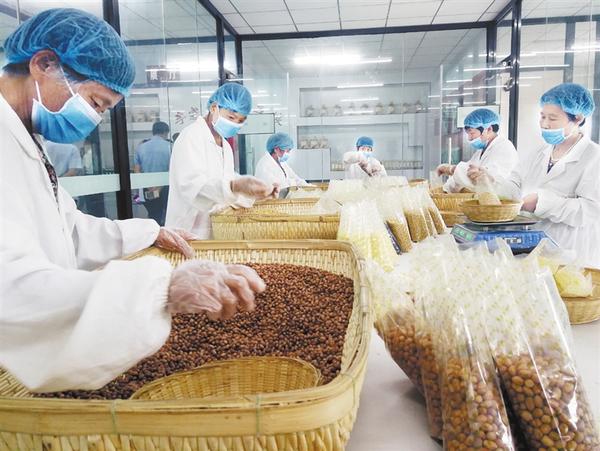 沈丘县冯营乡李寨行政村依托亿星集团组建李寨农业发展公司,通过挖掘“红色文化”资源,建立专门针对贫困人员就业的“支前粮”扶贫生产车间,帮助20多名特困人员实现就业。图为工人正在车间里包装“支前粮”。