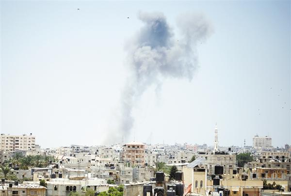 7月14日,在加沙地带南部拉法,遭到轰炸的区域冒起浓烟。以色列国防军14日发表声明说,以色列当天下午出动战机,对位于加沙地带的数十个巴勒斯坦伊斯兰抵抗运动(哈马斯)军事目标进行了轰炸。 新华社发