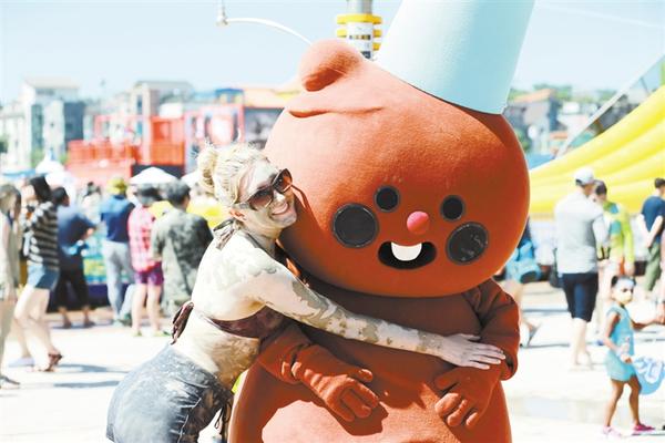 7月14日,游客在韩国保宁市举行的保宁泥浆节上和吉祥物人偶合影。2018年韩国保宁泥浆节于7月13日在韩国忠清南道保宁市大川海水浴场开幕,持续至本月22日。保宁泥浆节是韩国每年夏季的知名活动,游客可以在此期间参与各种使用泥浆的趣味游戏。新华社发