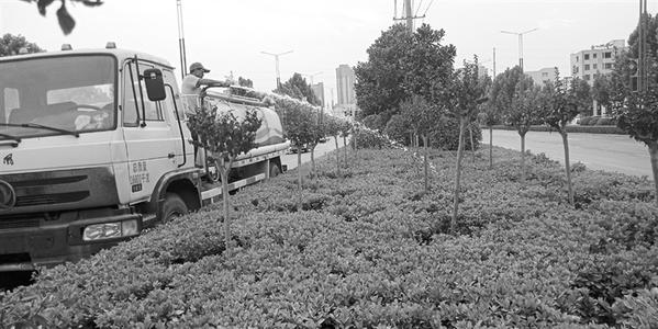 据统计,市园林处每天投入大型洒水车8辆、水泵12台,日均浇水2100余吨,有效缓解了园林绿化苗木旱情,巩固了绿化建设成果。(图为工作人员在为绿化带中的植物浇水。)①9