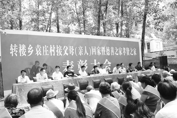 7月12日,太康县转楼乡袁庄村接父母(亲人)回家暨德善之家孝贤之家表彰大会举行,这是“四养”模式在该县的又一生动实践。太康县县委常委、宣传部部长谢成营,太康县政协副主席、民政局局长刘凤芹及转楼乡党委书记杨传俊、乡长陈靖辉等参加。据介绍,为实现脱贫保障全覆盖,太康县针对农村特困人员探索出集中供养、亲情赡养、社会托养、居村联养“四养模式”,有效破解了农村特困人员养老难题,受到广大群众欢迎。 记者 马治卫 摄
