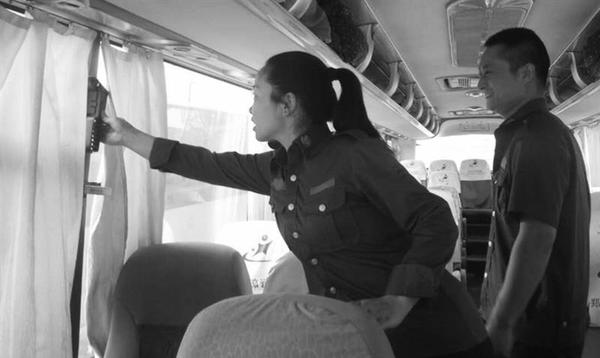 近日,我市道路运输管理机构开展道路运输安全专项整治行动,执法人员深入一线进行拉网式排查,消除安全隐患。图为7月10日,两名运管执法人员检查营运客车安全设备配备情况。李国学 摄
