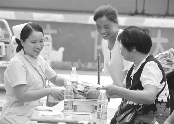 7月16日,周口人和医院医生在商水县郝岗镇范庄村文化大院内为贫困家庭开展免费义诊和送药活动。为加快贫困家庭脱贫致富步伐,商水县积极实施百企帮百村精准扶贫村企对接活动,120家民营企业发挥自身优势,开展健康扶贫、教育扶贫、金融帮扶等措施,力所能及地让143个帮扶对子的贫困村群众受益。