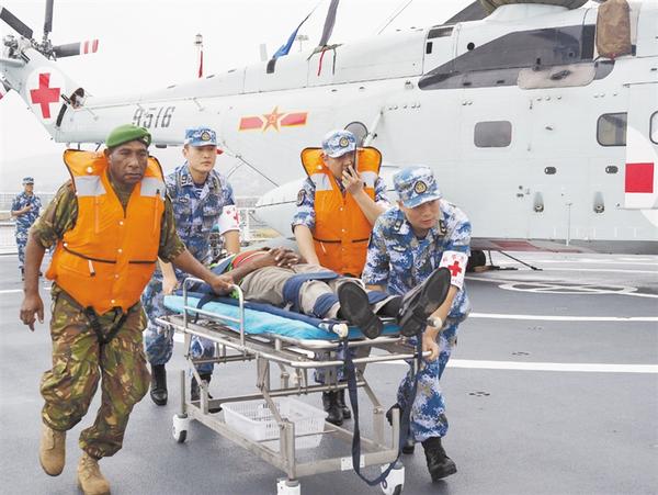 7月17日,在中国海军和平方舟医院船飞行甲板上,中巴新医护人员一起转运“伤员”。当地时间7月17日上午,正在执行“和谐使命-2018”任务的中国海军和平方舟医院船官兵与巴布亚新几内亚医务工作者在莫尔斯比港成功举行了一场联合应急医学救援演练。 新华社发