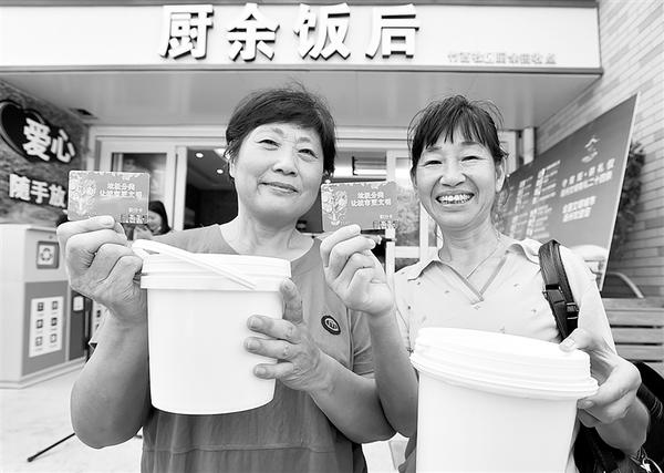 江苏扬州:厨余垃圾 变废为宝 7月18日,扬州市竹西社区居民展示领取的文明积分卡和家庭专用厨余垃圾回收桶。 当日,江苏省扬州市“厨余饭后”竹西社区厨余垃圾回收点在月明苑居民小区正式启用。