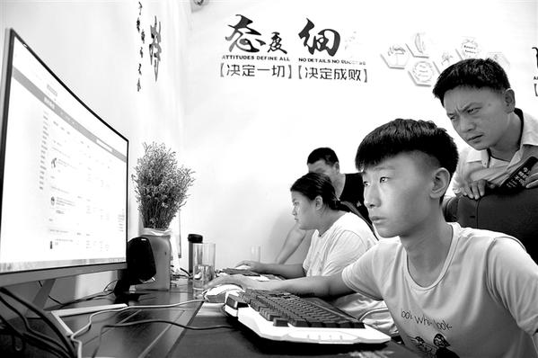 24岁的村民王江涛购置5台计算机创办家庭电商公司,全家上阵,互联网上比挣钱。图为该公司办公室一角。②5记者 付永奇 摄