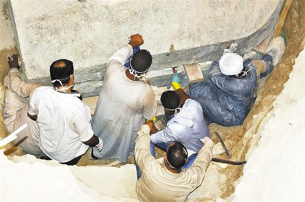 7月19日,考古人员在埃及亚历山大的石棺开启现场工作。