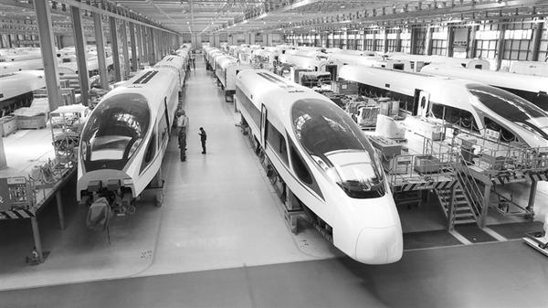 ①在位于吉林长春的中车长客股份公司高速动车组装配车间里,几列“复兴号”中国标准动车组在进行装配(2017年9月14日摄)。