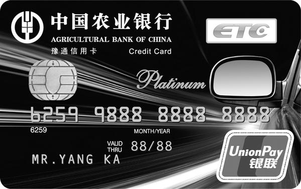 豫通ETC信用卡,是农行河南分行面向当地私家车主发行的一款地方性IC卡产品。产品采用银联品牌,分金卡、白金卡等级,除具备一般信用卡的金融功能外,办理这项业务的客户,可以享受多重优惠:一是成功申办豫通信用卡的客户,送电子标签OBU设备一套(价值300元)。二是持卡人在省内高速公路收费站点通过ETC专用通道进行缴费,享通行费最高9折优惠,省外ETC通行费也可享受优惠折扣。三是可享最长56天免息期,可参与农行“乐享周六”“商户促销有礼”“积分当钱花”等优惠活动,更可享活动期内屈臣氏满120元减30元,必胜客满120元减40.01元等特惠活动。四是豫通信用卡白金卡持卡人,可享受新郑机场72小时免费停车,五星级酒店3小时免费休息或免费商务套餐,免费接送机服务;郑州高铁站和全国指定机场48小时1元停车(3次/年)或2小时停车(10次/年)服务。