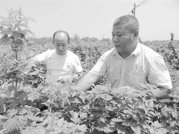 7月31日,商水县人社局驻白寺镇木庄村第一书记冉高峰(右)向镇领导介绍红树莓管理情况。冉高峰流转土地120亩种植红树莓,安排60名贫困群众就业。在他带动和帮助下,周边村庄发展树莓200多亩,亩均纯收入7000元。
