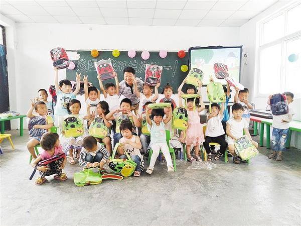 朱亚洲给夏营村小学留守儿童送去新书包。 记者 杨光林 摄