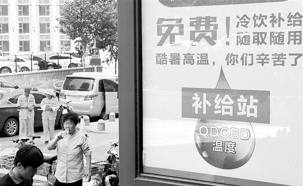 这是8月2日在青岛市北区中央商务区拍摄的一“清凉补给站”标识牌。 近日,山东省青岛市持续高温,社会公益组织发起“关爱高温劳作群体”活动倡议,爱心机构和企业积极响应,在户外公共区域摆放冰柜、设置饮品自助发放点,为环卫工人、交警、快递员和外卖人员等露天高温作业者免费提供“清凉补给”。新华社发