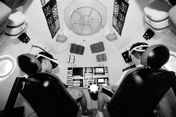 8月7日,游客在西安“九号宇宙”航天科普研学基地体验VR及震动模拟返回舱。