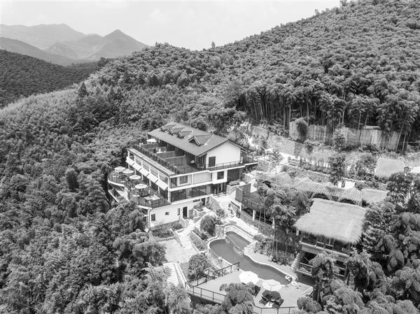 德清县莫干山景区的民宿“西竹云见”(8月8日无人机拍摄)。房间采暖制冷、热水供应、餐饮等皆使用空气能热泵,不使用传统燃料。