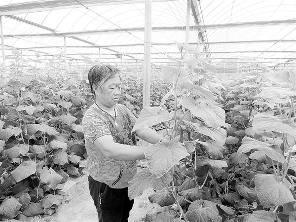 8月10日,沈丘县周营镇李楼营村的一位村民在当地一处现代温室大棚基地忙着为晚秋订单小黄瓜绑蔓、打叉、蘸花授粉。
