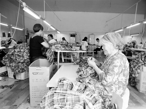 8月12日,在沈丘县周营镇欧营村一家服饰有限公司,当地的留守妇女正在加工订单服装。