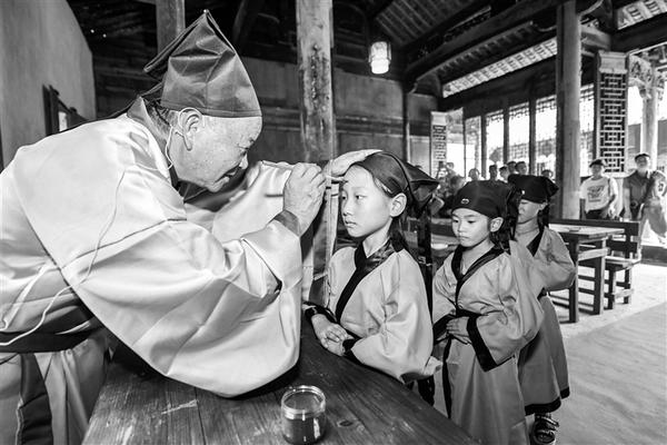 当日,浙江省长兴县小浦镇中山村在古宅“吴宅”中举办以“开蒙启智,尚礼乐学”为主题的升学礼活动。当地的退休老教师在活动中为孩子们正衣冠、点朱砂,孩子们诵读《弟子规》、写“人”字并给老师奉茶。