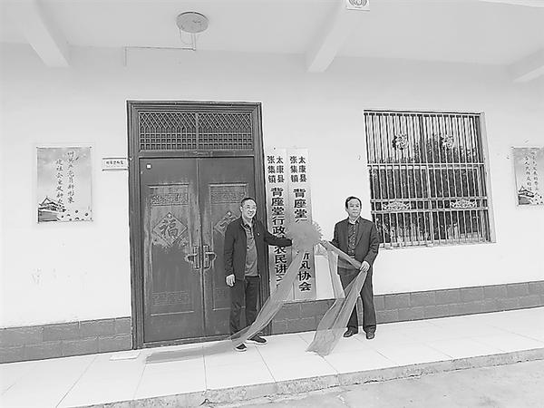 图二:张集镇党委书记杨华(左一)为背座堂村新风协会农民讲习所揭牌。