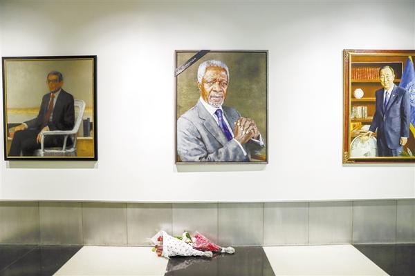 8月18日,在位于纽约的联合国总部,联合国前秘书长科菲·安南的画像下摆放着鲜花。