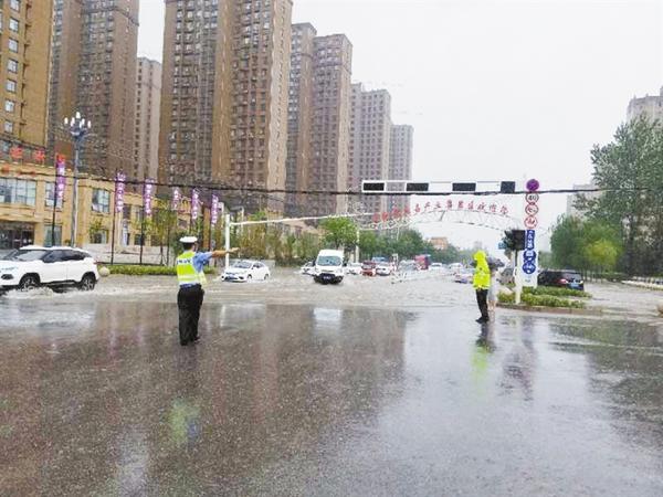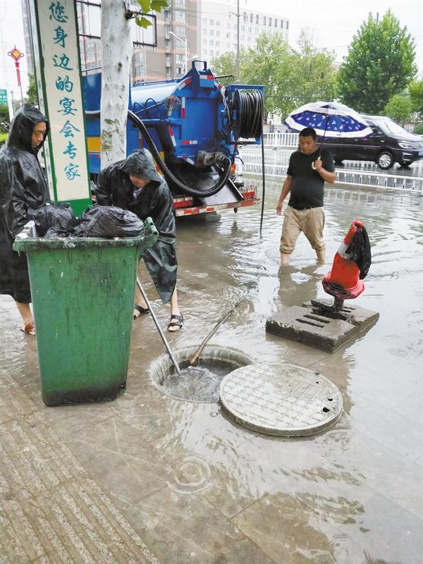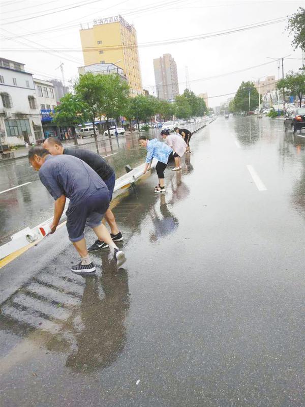 图三为水利、交通、城管等工作人员冒雨排涝。