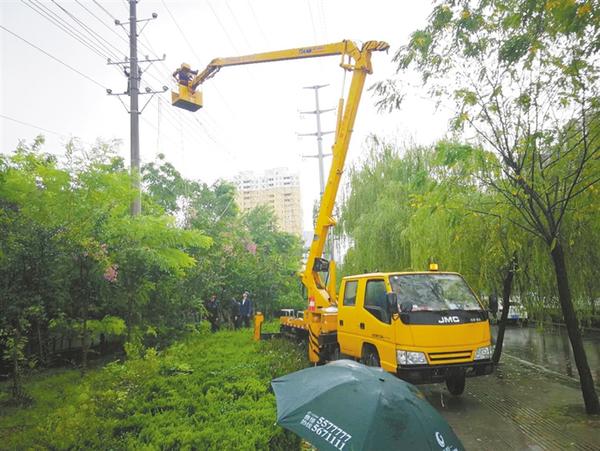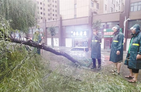 图五为交警、城管人员冒雨清理被刮倒树木。记者 韦伟 摄